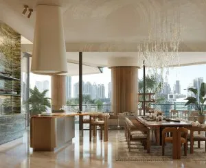 Eywa is a residential development on Dubai Water Canal, Total areas of the units range from 3,064 sq. ft to 16,256 sq. ft. As the G+3P+19-storey project is inspired by the Tree of Life, all residences will show a strong connection to natural elements, including stone and engineered wood flooring. All premises will feature private terraces with dining areas and hammocks, as well as private waterfalls and swimming pools. European appliances with high energy ratings and signature stone countertops will be present in the kitchens. Generous storage spaces will be offered to the occupants of Eywa.